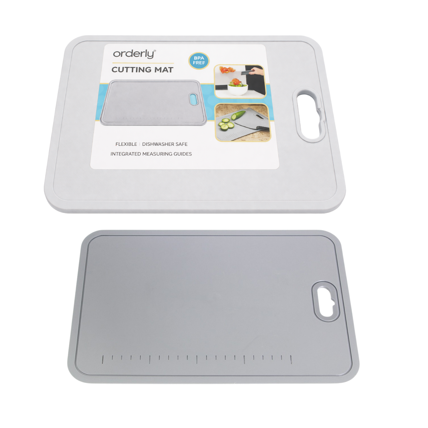 Designed for streamlined prep in any space, this Gray plastic cutting mat brings together clean lines, practical details, and everyday convenience. Sized for daily use yet slim enough to store easily, it works as one of your go-to kitchen cutting boards without crowding drawers or counters. A built-in measurement marking along the edge helps guide portioning and layout during prep, making this board a simple upgrade for home cooks who want added visual reference on a compact, small cutting-mat-style surface. The plastic construction offers a comfortable cutting-mat feel while intaining the stability of a solid board. Rounded corners and smooth edges support easy handling, and the integrated handle cutout allows you to lift, carry, or hang the mat between uses. The recessed border helps contain crumbs and liquids on the cutting surface, keeping your surrounding workspace tidier as you prepare ingredients.